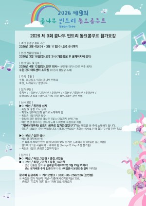 2026 제 9회 콩나무 빈트리 동요콩쿠르 | 예선 동영상 접수 기간 | 2026년 3월 4일(수) ~ 3월 11일(수) 오후 6시까지 | 본선 진출팀 발표 | 2026년 3월 16일(월) 오후 3시 (개별통보 후 홈페이지에 공지) | 본선 일시 및 장소 | 2026년 4월 12일(일) 오전 10시~ (부문별 대기시간은 추후 공지) 수원 경기아트센터 소극장 (수원시 팔달구 소재) | 주최. 후원 | 주최_ 동요작곡가모임 콩나무 빈트리 후원_ 나라뮤직 / 중앙아트 | 참가 부문 | 유치부 / 1학년부 / 2학년부 / 3학년부…