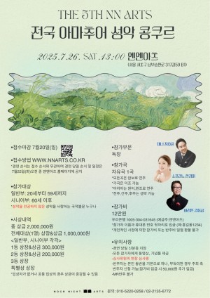 The 5th NN Arts 전국 아마추어 성악 콩쿠르●경연날짜7월26일(토) 1시 ●경연장소엔엔아츠 ●접수마감7월20일(일) ●접수방법www.nnarts.co.kr (혹은 QR스캔) *경연 순서는 접수 순서와 무관하며 경연 당일 순서 및 일정은 7월22일(화)오전 중 엔엔아츠 홈페이지에 공지 ●참가대상 일반부: 20세부터 59세까지 시니어부: 60세 이후 *성악을 전공하지 않은 성악을 사랑하는 국적 불문 누구나 ●참가부문 독창 ●참가곡 자유곡 1곡 *모든곡은 암보로 연주 *가곡은 이조 가능 *아리아는 원어, 원조로 연주 *전주, …