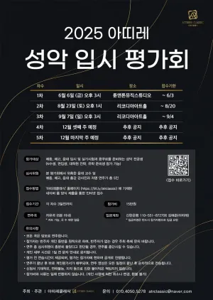 2025 아띠레 성악 입시 평가회 •현장 대면 피드백 시스템•디테일한 개인 평가서 제공•연주 영상 제공•참관 가능 ●일시 및 장소 1차: 6월 6일 (금) 3PM 튠앤톤뮤직스튜디오 2차: 8월 23일 (토) 1PM 리코디아아트홀 3차: 9월 7일 (일) 3PM 리코디아아트홀 4차: 12월 셋째주 진행 예정 5차: 12월 마지막주 진행 예정 ●참가 대상 입시 및 실기시험과 콩쿠르를 준비하는 성악 전공생 누구나 ●접수 각 차수 3일전까지 홈페이지 접수https://litt.ly/atrclassic •아띠레평가회 이벤트 OPEN 인스타그…